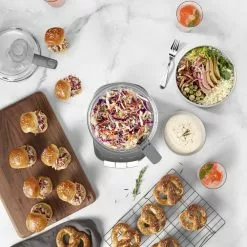 Power through pesto, homemade nut butter, ground meats, and more with the Cuisinart Core Custom 10 Cup Multifunction Food Processor in Anchor Grey! This food processor features a wide mouth feed tube, control paddles, a versatile motor platform, and a sealing lid that prevents spills and splatters. The control paddles offer low, high, mix, and pulse functionality. With a 10-cup capacity, this food processor is equipped to handle 10 cups of sliced or shredded food, 6 cups of chopped food, or 2.5 cups of dough. The innovative motor platform allows this machine to use multiple functions, attachments, and accessories. Each removable part is dishwasher-safe, making cleanup a breeze! Whether you’re making cookies, kneading dough, or making salsa, simplify the process with the Cuisinart Core Custom 10 Cup Multifunction Food Processor!