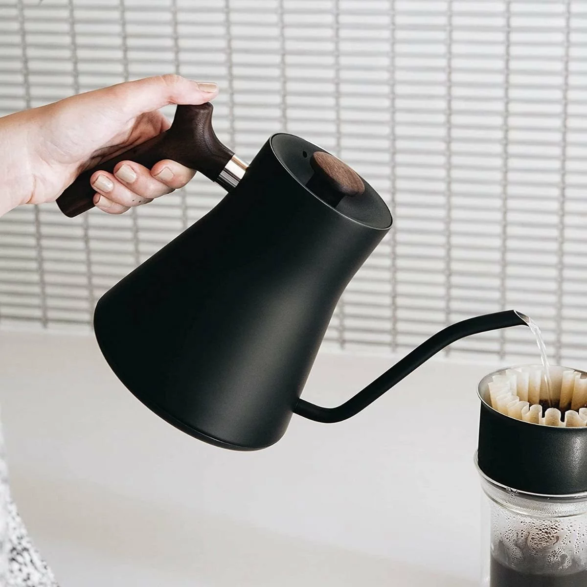 Designed to deliver an outstanding pour-over coffee every time, the Stagg EKG Electric Pour Over Kettle (Matte Black & Walnut) brings a stylish design and unmatched efficiency to your morning routine! The 0.9L stainless steel kettle features a modern Matte Black finish with rich walnut handles. The extended gooseneck has a precision spout design to control flow rate and works with the counterbalanced handle to invite the precise, slow pouring that is the key to getting the best flavor from pour-over coffee.