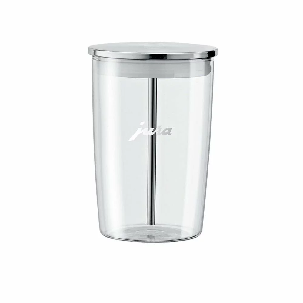 - Jura 16.9oz Glass Milk Container – Treat yourself to creamy macchiatos and cappuccinos with Jura’s Glass Milk Container! Compatible with all Jura models with a frothing system, this milk container will be one of your favorite accessories. With a 16.9oz capacity, you can whip up enough froth to spoil the family or a group of friends with gourmet coffees. The easy, hassle-free design plugs directly into the machine, as it comes with a hygienic milk tube that connects from your Milk Container and into the machine, and is the perfect height for the froth to flow seamlessly. If you feel you need to prepare for tomorrow’s coffee, fill your Milk Container with fresh milk and set it conveniently on the shelves of your refrigerator door to set out to connect to your Jura ENA 8 model. Once your favorite beverage is ready to enjoy, simply disassemble the Jura Milk Container, set the parts in the dishwasher, and join in on the living room chatter with your piping hot coffee in hand!